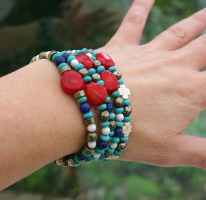 Red Coral, Turquoise Magnesite, Pyrite, Lapis Lazuli Stretchy Bracelet